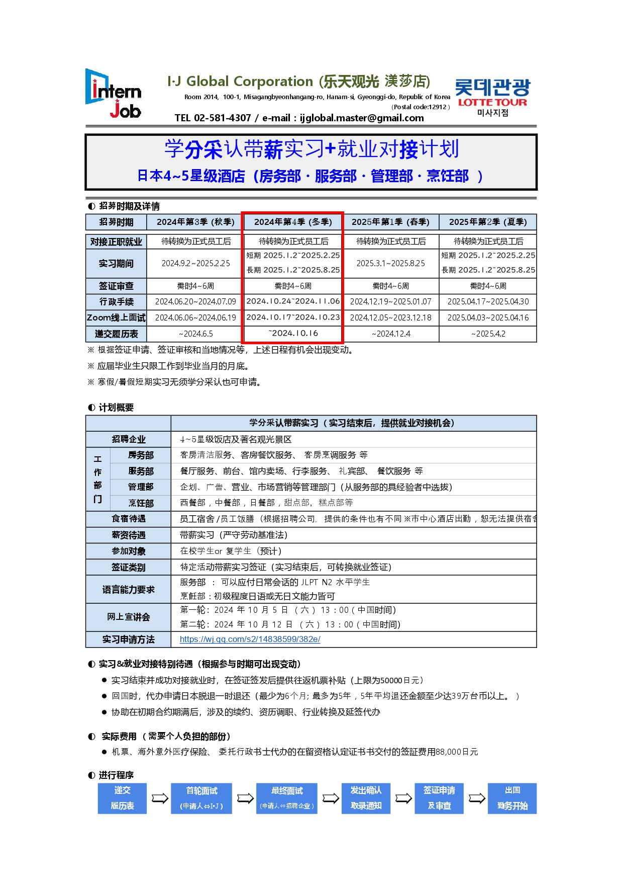 [韩国] 2024年第4季(寒假)招募- 外国人留学生 实习+就业对接计划 韩国4~5星级酒店